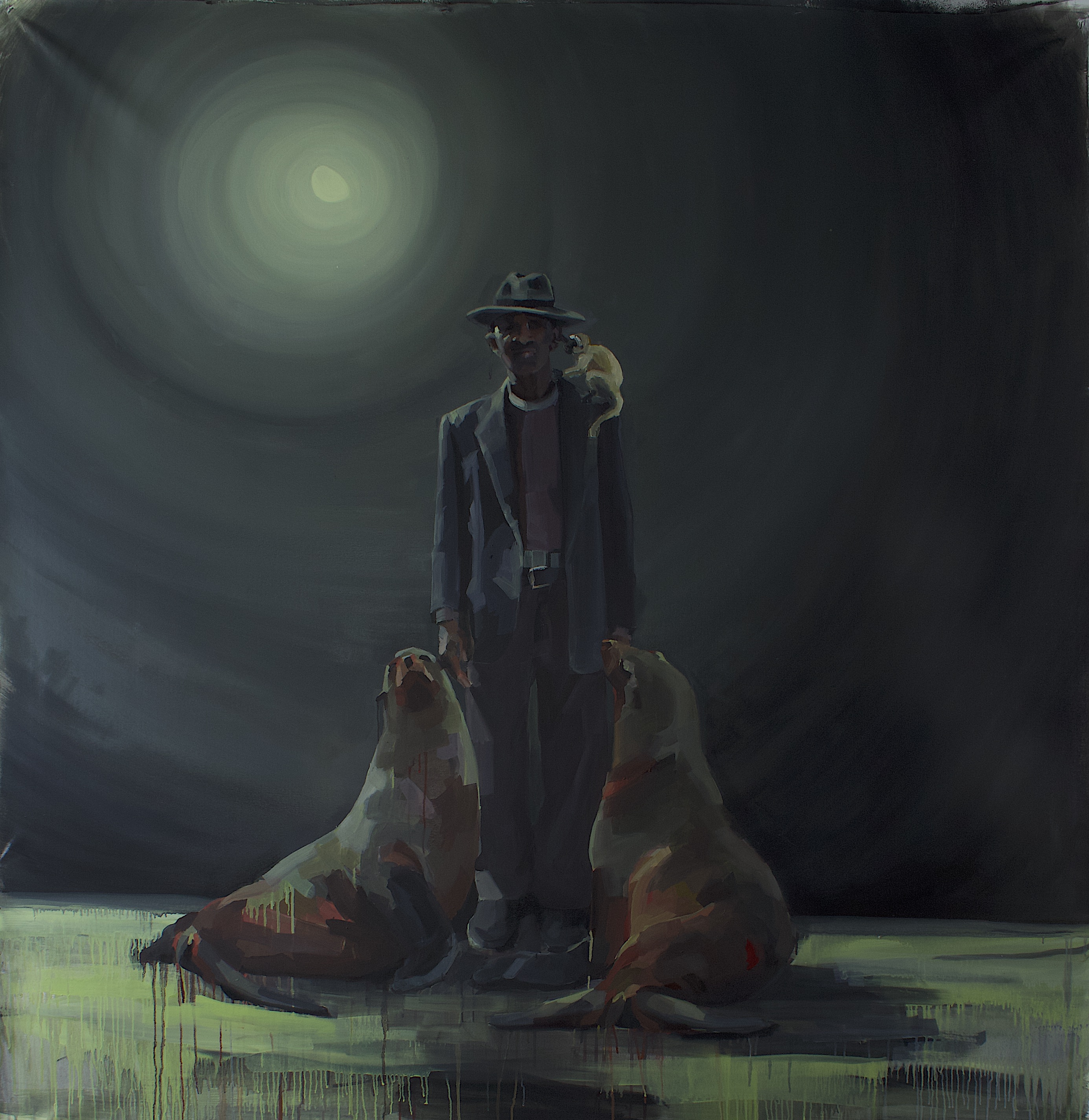 This work from Africa does not depict suffering but premises a symbolic realm where the longing for wholeness, even perhaps with things antithetical, can be real. Simple fictions of accompaniment in day work and day dreams—playful, mysterious, absurd, violent—inhabit vulnerable and indeterminate spaces. Text from apartheid and other documents haunts and complicates an easy relationship with the imagery. Some of these dreams recapture symbolic power through proximity and painterly integration, while others express remorse and wrong. Through the technique of disruptive realism, they provide a longed-for connection with things distant, lost or removed. They each allow the viewer to perhaps question the impossible, to perhaps feel interdependence, and to perhaps participate in healing.