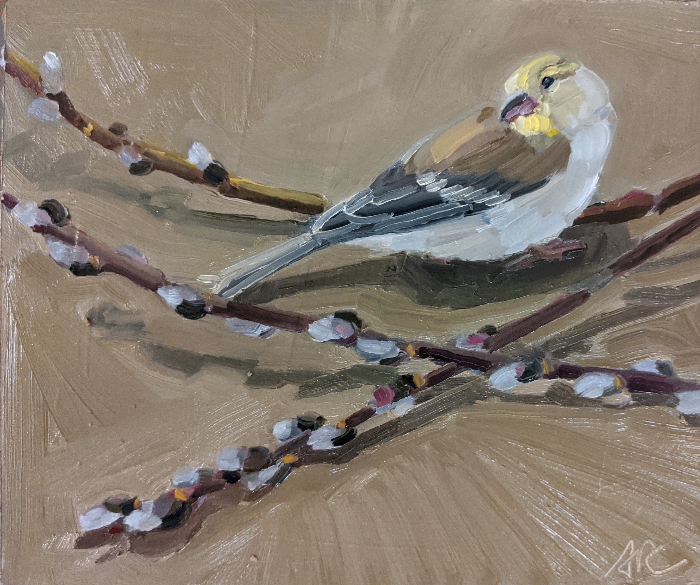 New England springs in their faltering progress recapitulate all the classic faith trials. When this tiny painting was done two weeks and a snowstorm ago, the world outside was pretty drab. Looking closely, you could find pussy willow bushes along the sunken edges of fields beginning to throw a little silver, and the slow drip of hopeful canary yellow pooling around the nape of a molting goldfinch. My heart clings desperately to these unspectacular beginnings.