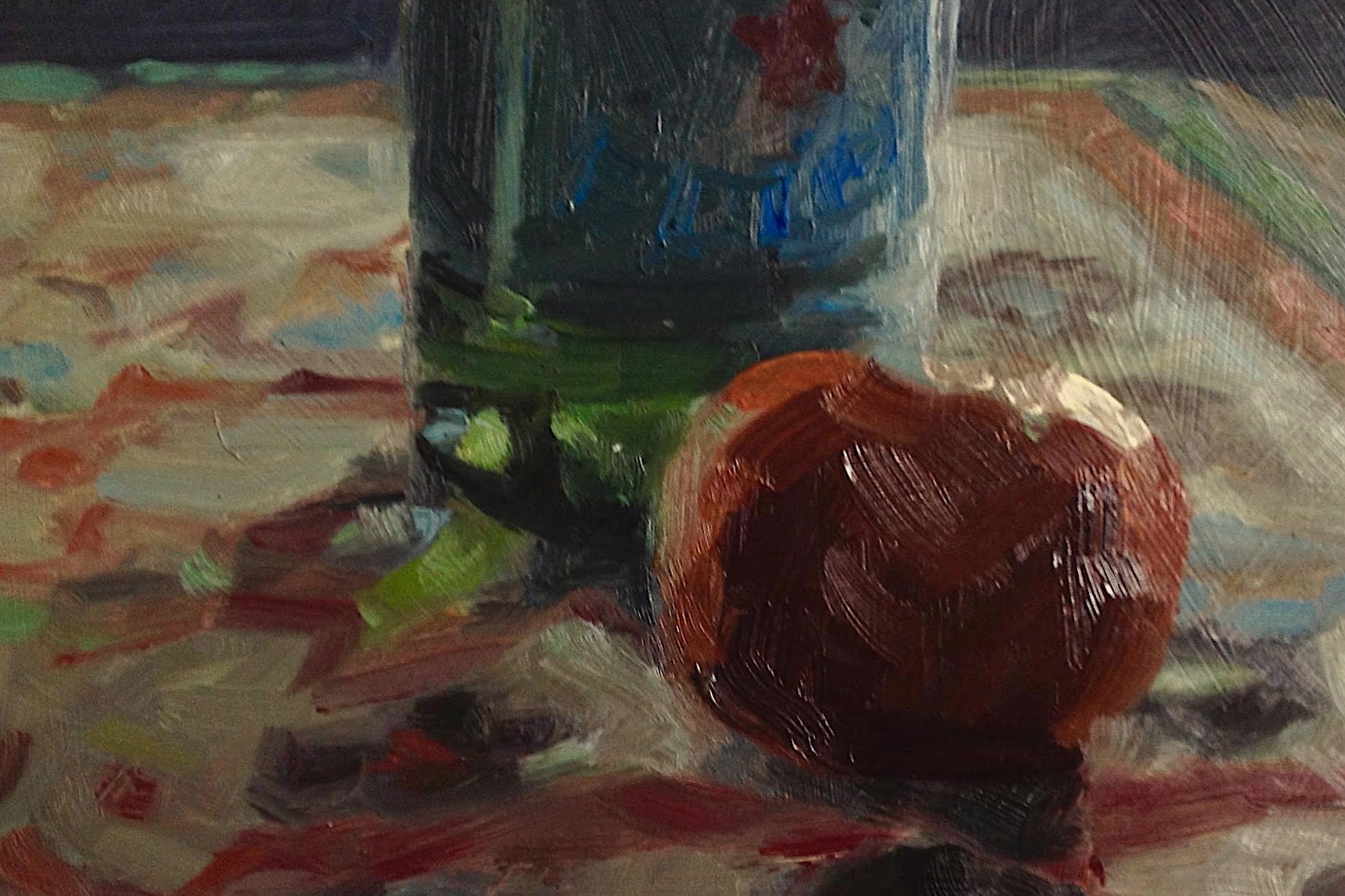 I like to say about perception-based painting that any grace that may be captured is a result of an encounter rather than an intention. The green flecks of light from the San Pellegrino bottle onto the carpet was my graceful encounter in this little one.