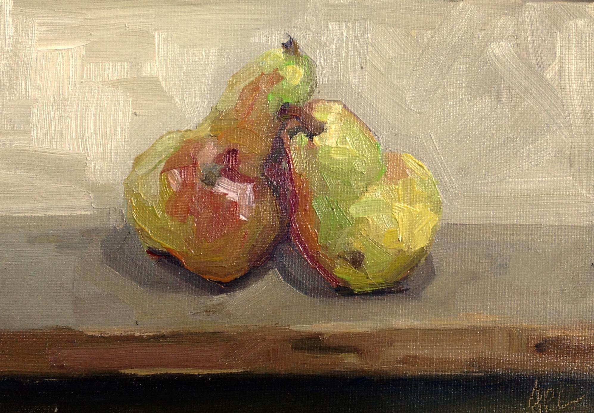 I understand why pears are such a classic painting subject. In one organic package, they provide all the form, color, light and personality a painter could want... all in one dependable year-round studio snack!
